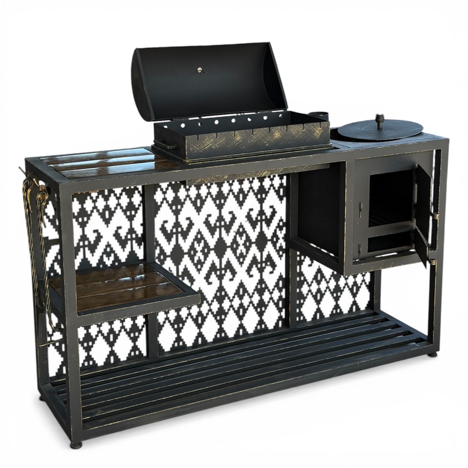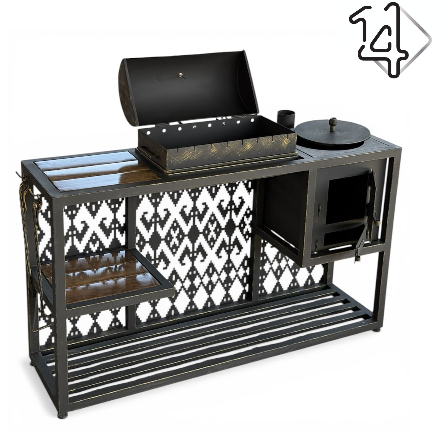 изготавливается из листовой стали 3,0 мм, окрашена термостойкой эмалью (цвет - чёрный), в крышке жаровни имеется термодатчик для контроля температуры приготовления пищи. Печь изготавливается из листовой стали 3,0 и 4,0 мм, окрашена термостойкой эмалью (цвет - чёрный), в задней стенке имеется колено для продолжения дымохода, имеется зольник. |