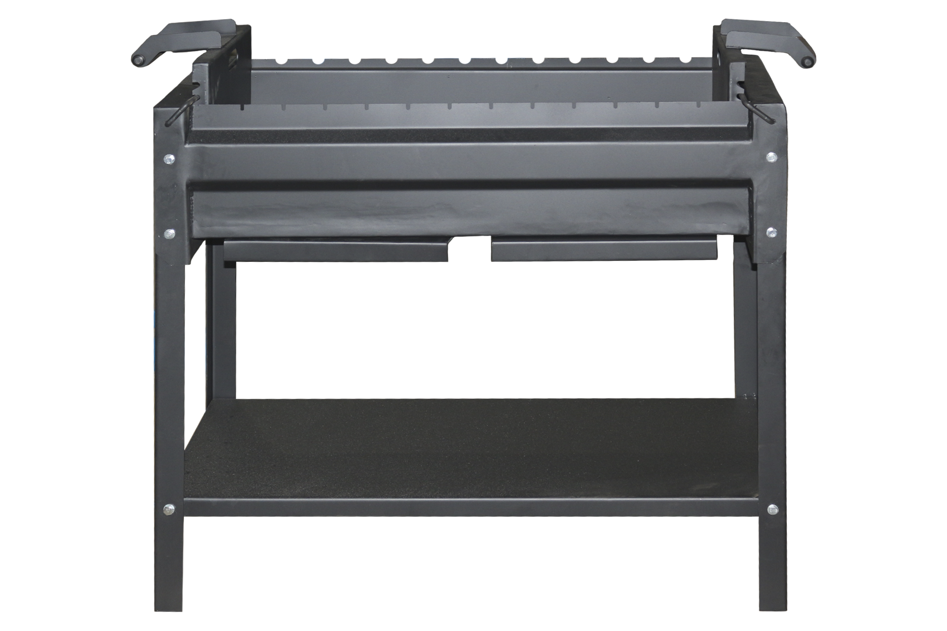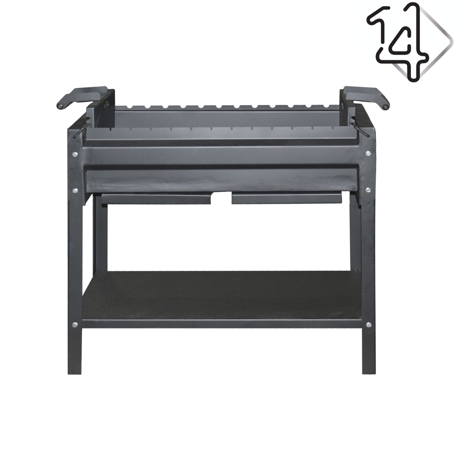 Мангал имеет двенадцать гнезд под шампура, нижнюю полку для дров, регулируемую по высоте жаровню с перфорированным дном и зольниками.
