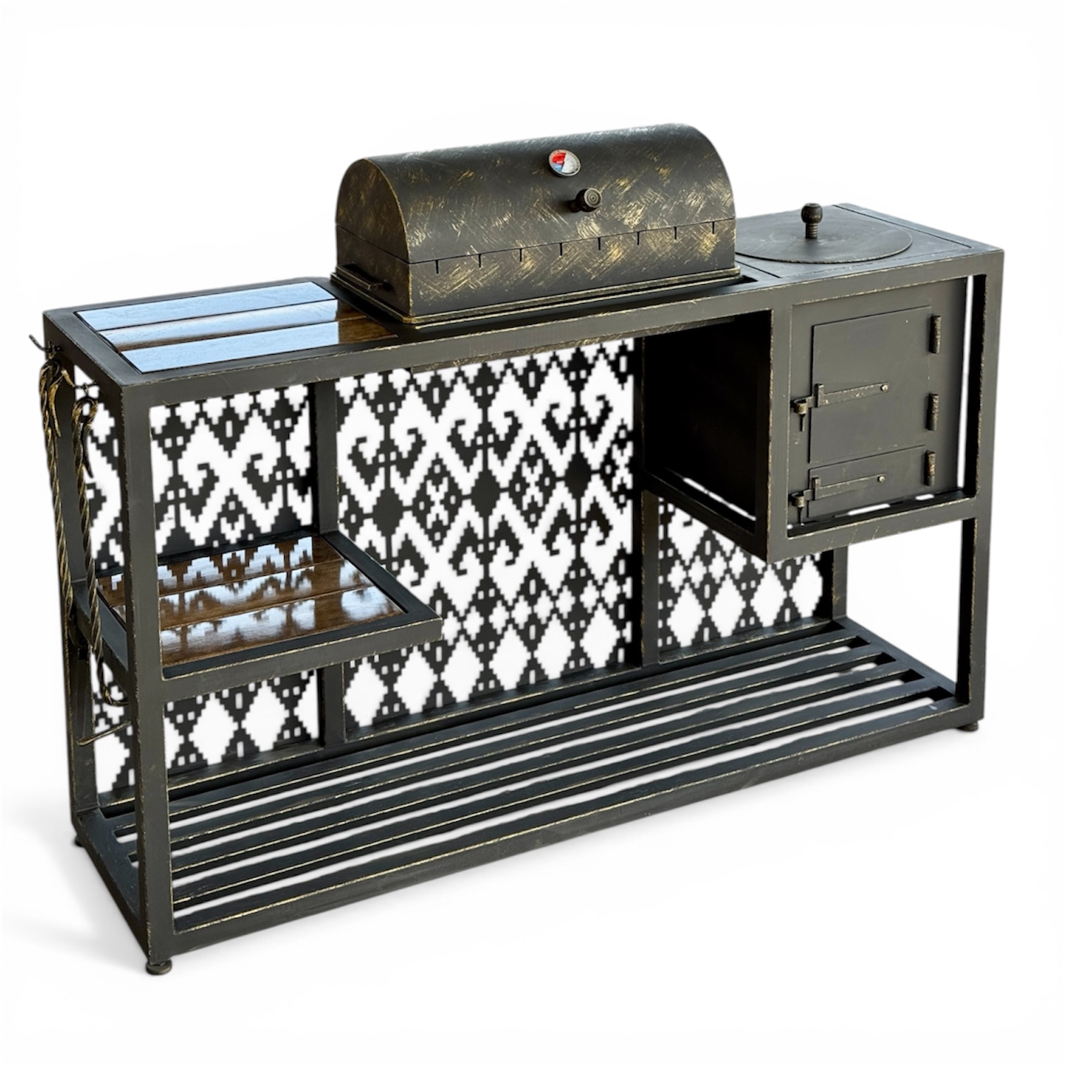 изготавливается из листовой стали 3,0 мм, окрашена термостойкой эмалью (цвет - чёрный), в крышке жаровни имеется термодатчик для контроля температуры приготовления пищи. Печь изготавливается из листовой стали 3,0 и 4,0 мм, окрашена термостойкой эмалью (цвет - чёрный), в задней стенке имеется колено для продолжения дымохода, имеется зольник. |